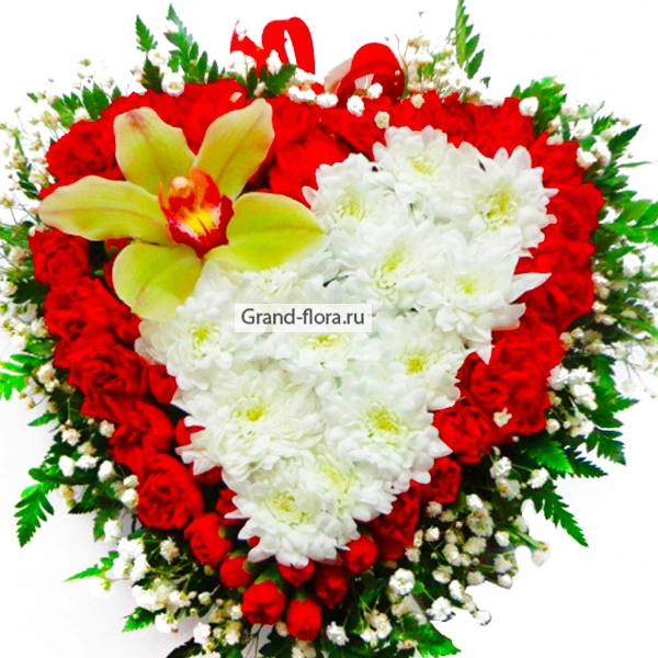 ЛЮКС гвоздика красная кустовая - 28 шт., хризантема кустовая белая  - 7 шт., орхидея (цветок) - 2 шт., гипсофила -  3 шт., папоротник - 5 шт., лента, оазис сердце.